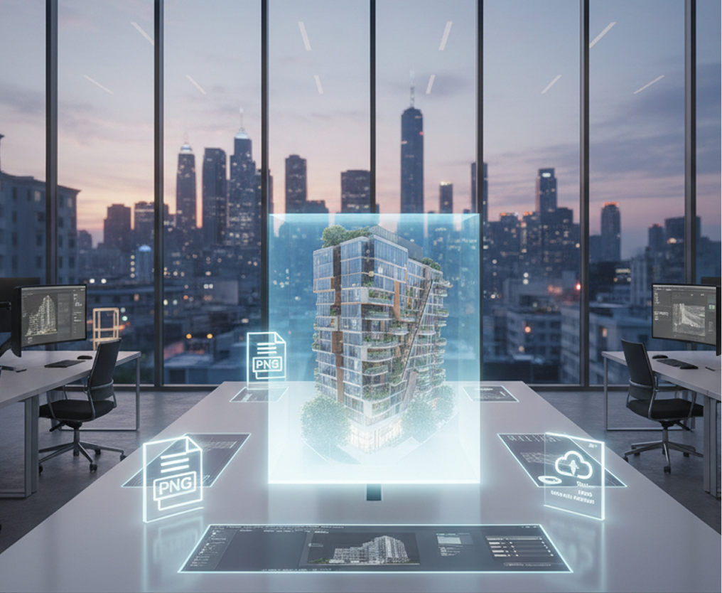 Download in pre-set formats perfect for client presentations, project mood boards, social media, and architectural portfolios.