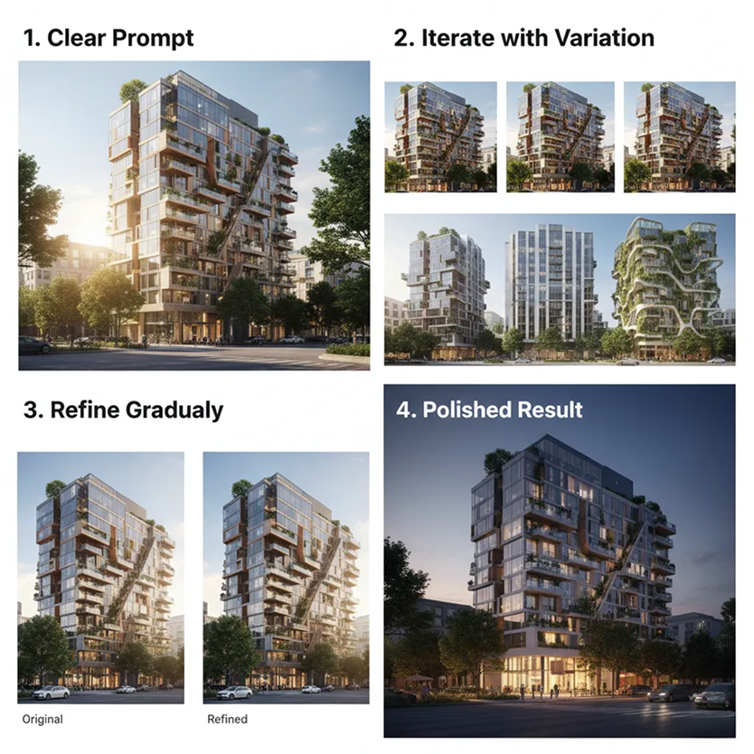 Refine materials, adjust lighting, modify the facade composition, or change the architectural style in a click—no complex CAD or 3D rendering software required.