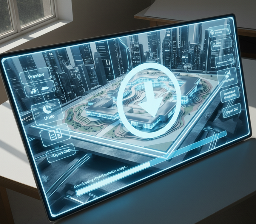 Preview your design in a live view, undo any changes instantly, then download your concept as a high‑resolution image (PNG, JPG) or as a layered file for further development in your CAD or rendering software.