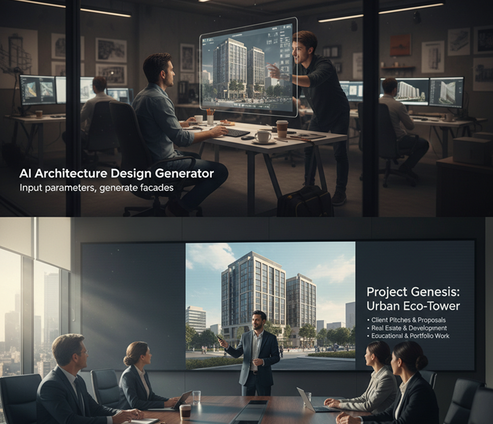 AI as Your In-House Concept Architect. Generate hundreds of cohesive design variations—from adjusting massing and fenestration to experimenting with materiality, context, and lighting. This tool becomes your endless source of inspiration, helping you build a rich, scalable concept library that pushes creative boundaries—always on-brief, always visionary.