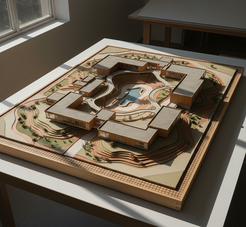 The AI understands architectural styles. From Brutalist concrete facades to Modernist glass structures and traditional vernacular forms, it adapts the visual concept to match your project brief.