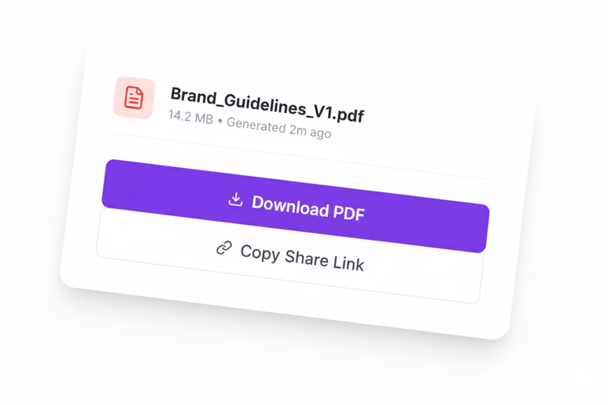 Download your brand book as a PDF, or export every logo, icon, and palette as high-res JPG, PNG, and editable SVG files for seamless integration.