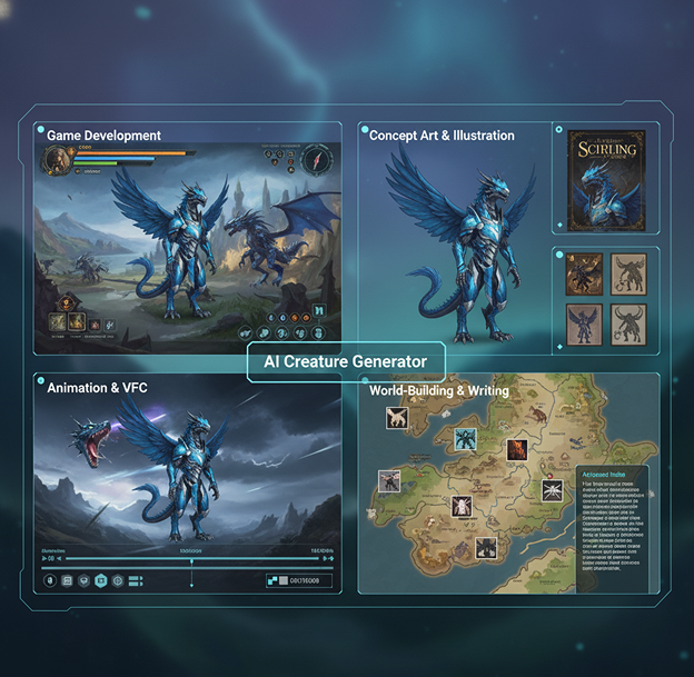 "In the studio, we use this to brainstorm creature designs before any sketching begins. It lets us explore dozens of stylistic and anatomical directions in an hour—something that used to take a week."