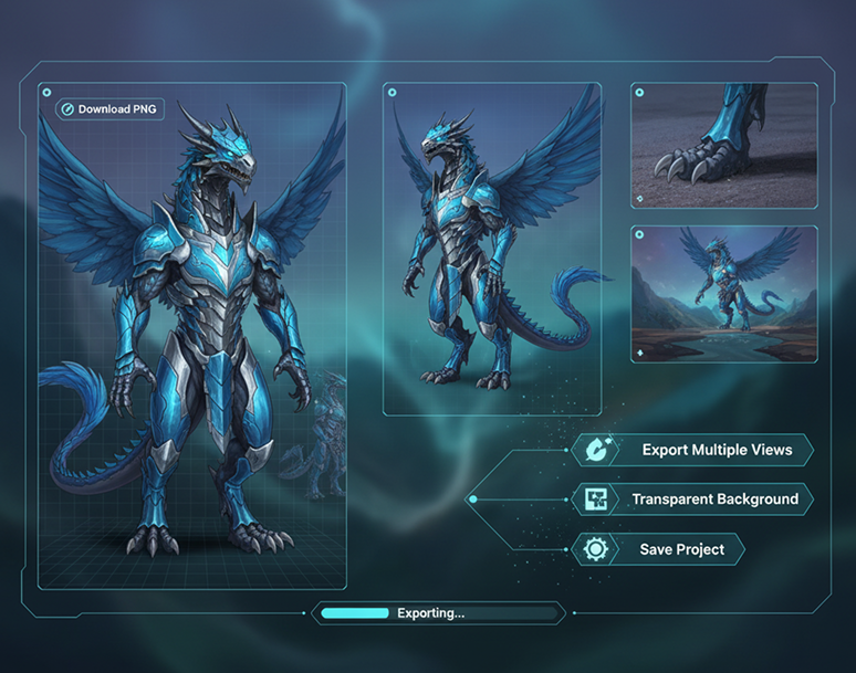Exporting your creature concepts is straightforward and adaptable. You retain full control over format, resolution, and final polish—and can return to edit or evolve your designs anytime.