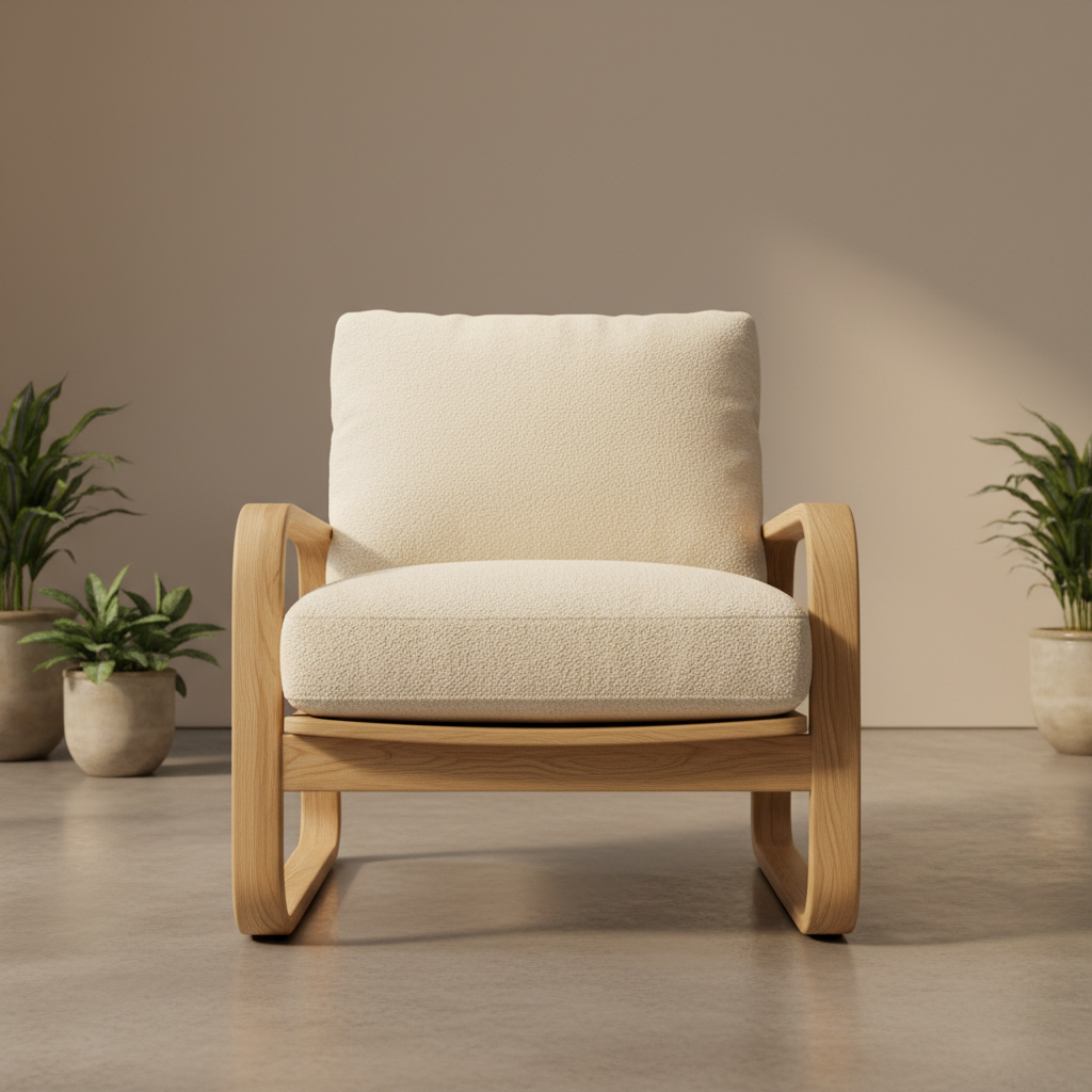 Create a minimalist lounge chair inspired by Scandinavian aesthetics. Use light oak wood for the frame and textured cream boucle fabric. Soft organic curves, low profile, warm studio lighting.
