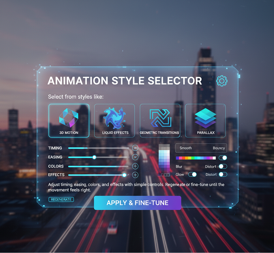 Select from styles like 3D motion, liquid effects, geometric transitions, or parallax. Adjust timing, easing, colors, and effects with simple controls. Regenerate or fine‑tune until the movement feels just right.