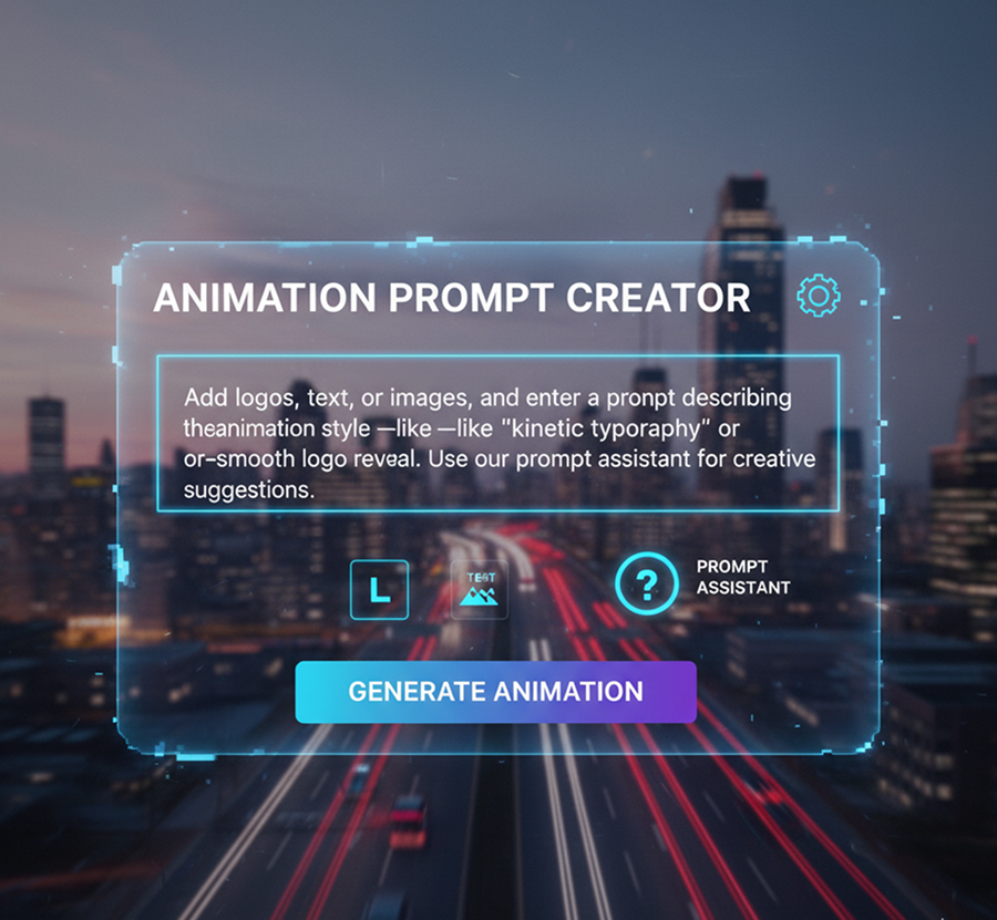 Add logos, text, or images, and enter a prompt describing the animation style—like "kinetic typography" or "smooth logo reveal." Use our prompt assistant for creative suggestions.