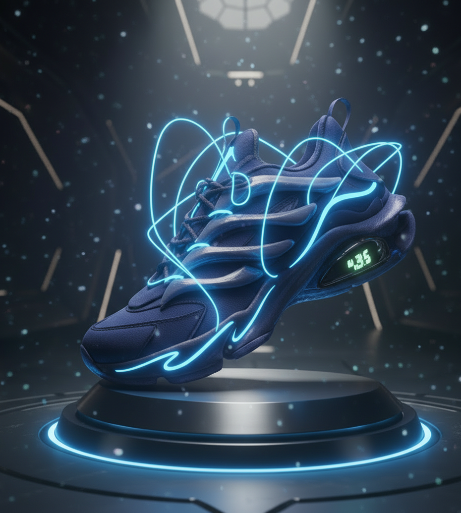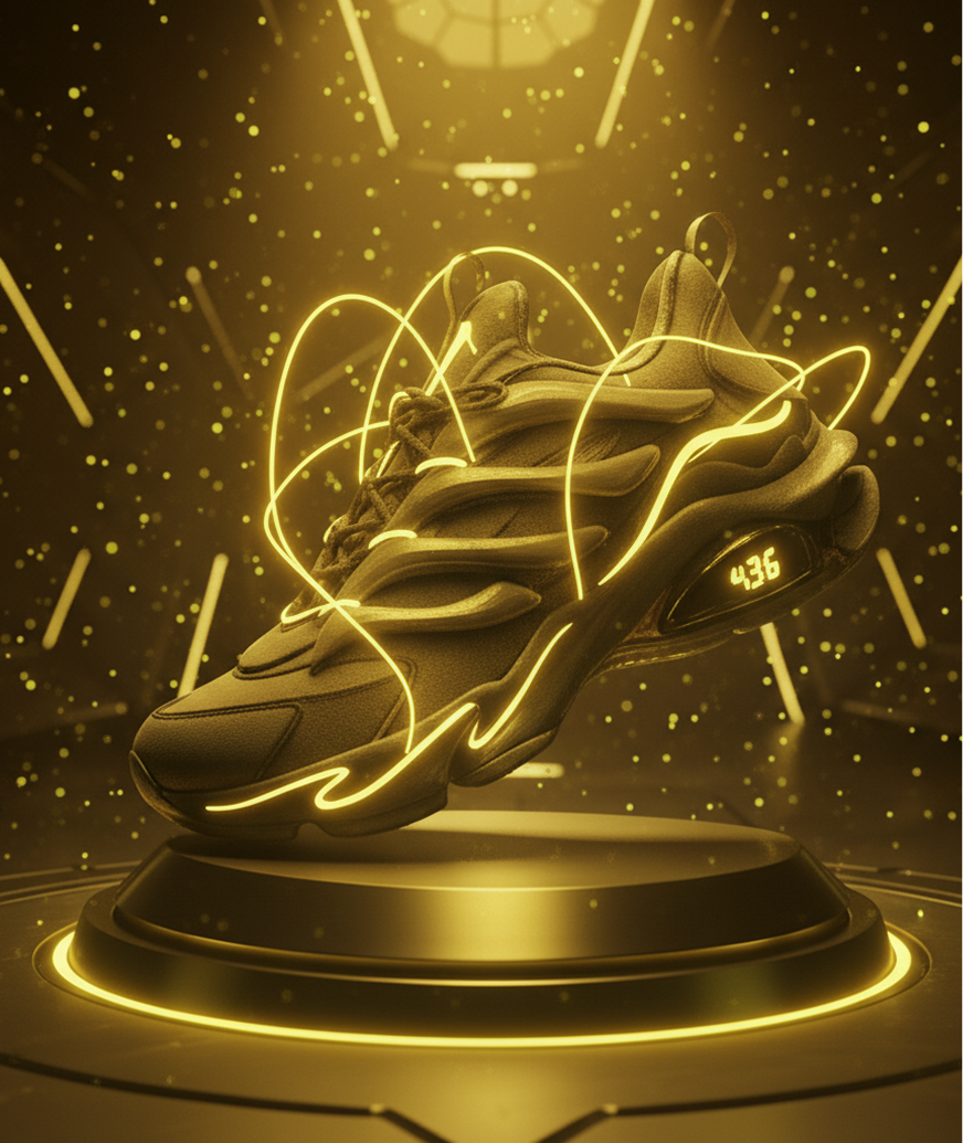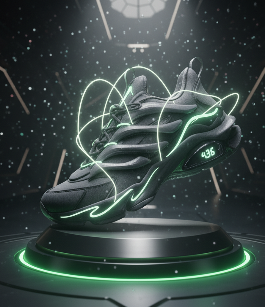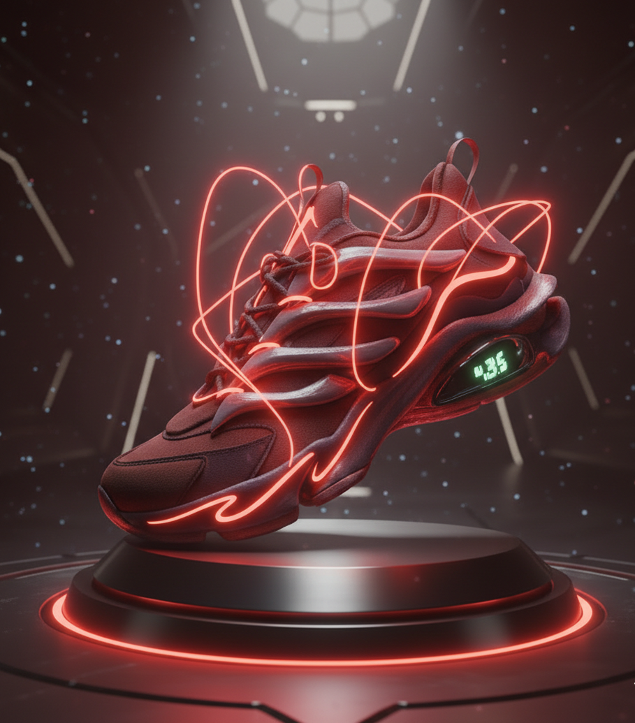 Hyper-realistic futuristic sneaker concept, organic biomimetic shapes, glowing neon accents, 8k product render, studio lighting --v 5.0