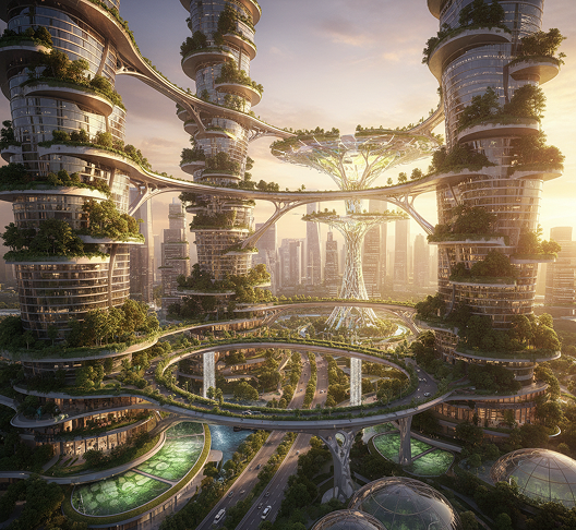 Cinematic drone shot of a futuristic eco-city with hanging gardens, golden hour lighting, 4k resolution.