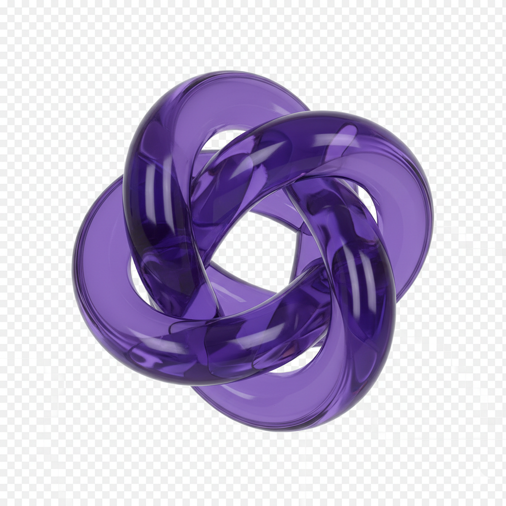 A glossy 3D geometric torus knot, violet glass material, studio lighting, transparent background
