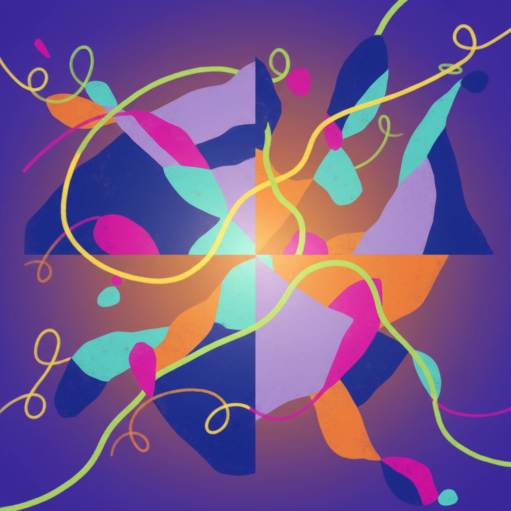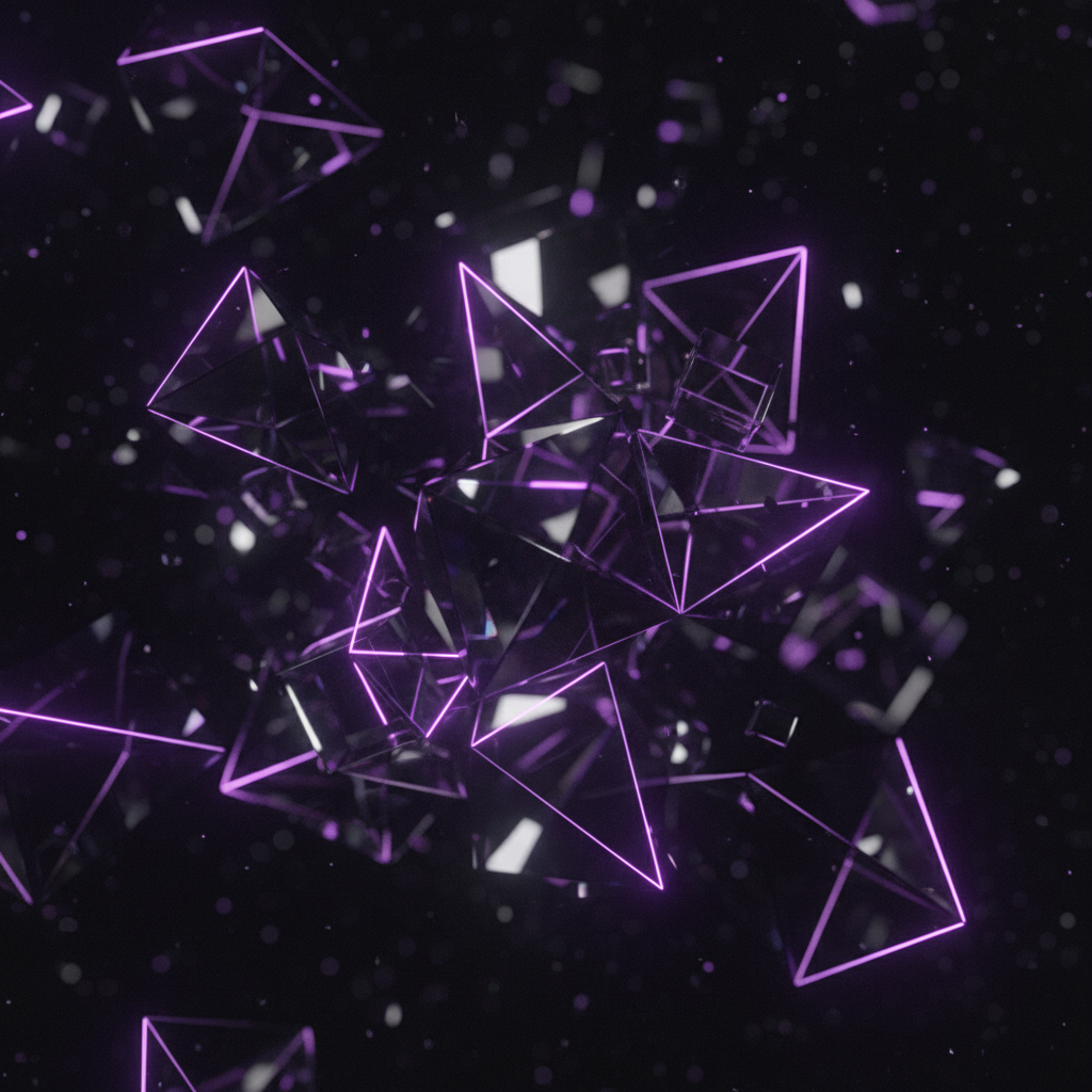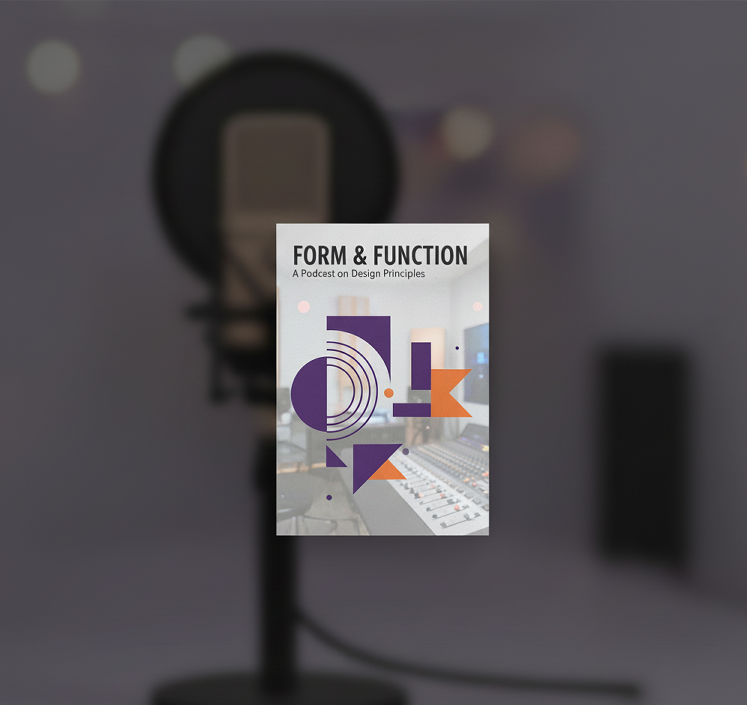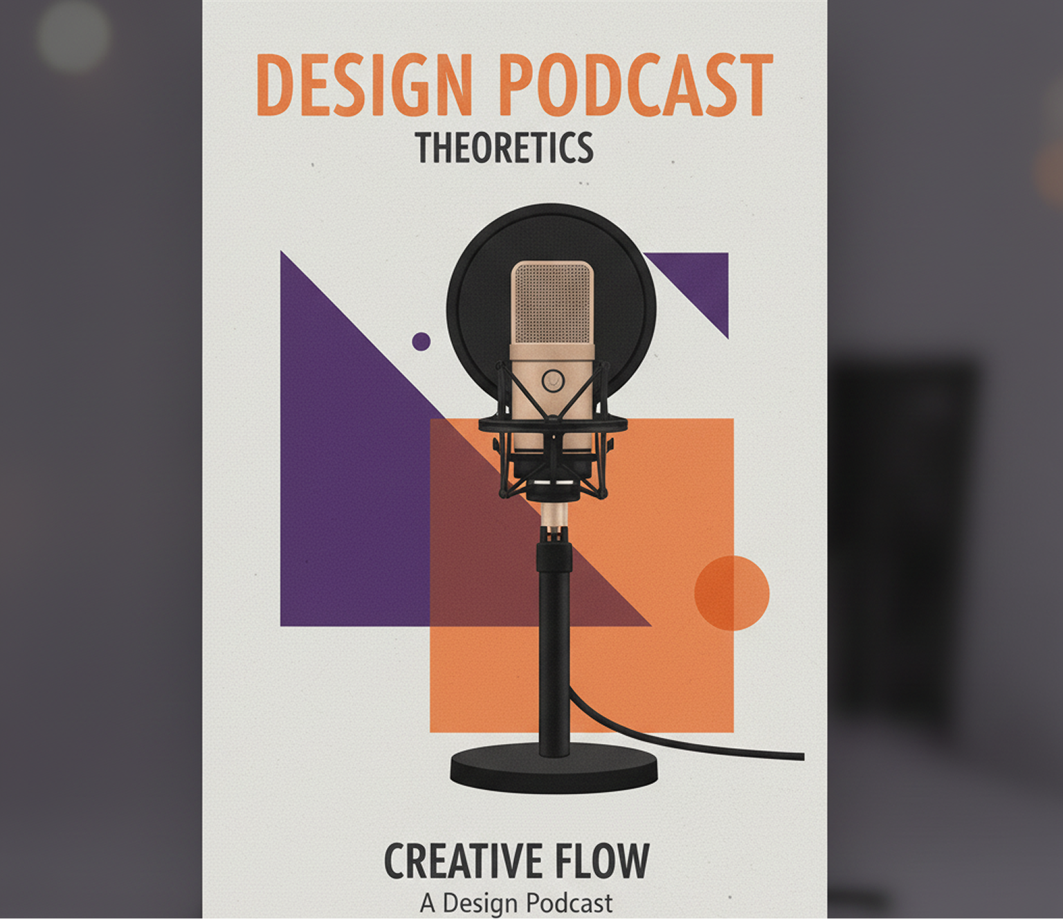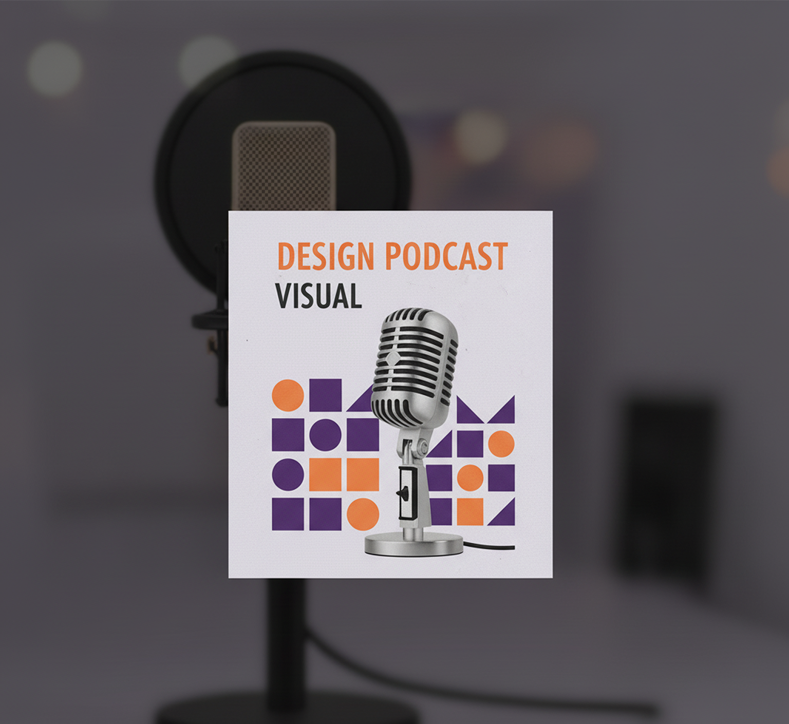 "A minimalist cover for a design podcast featuring abstract geometric shapes in violet and orange."