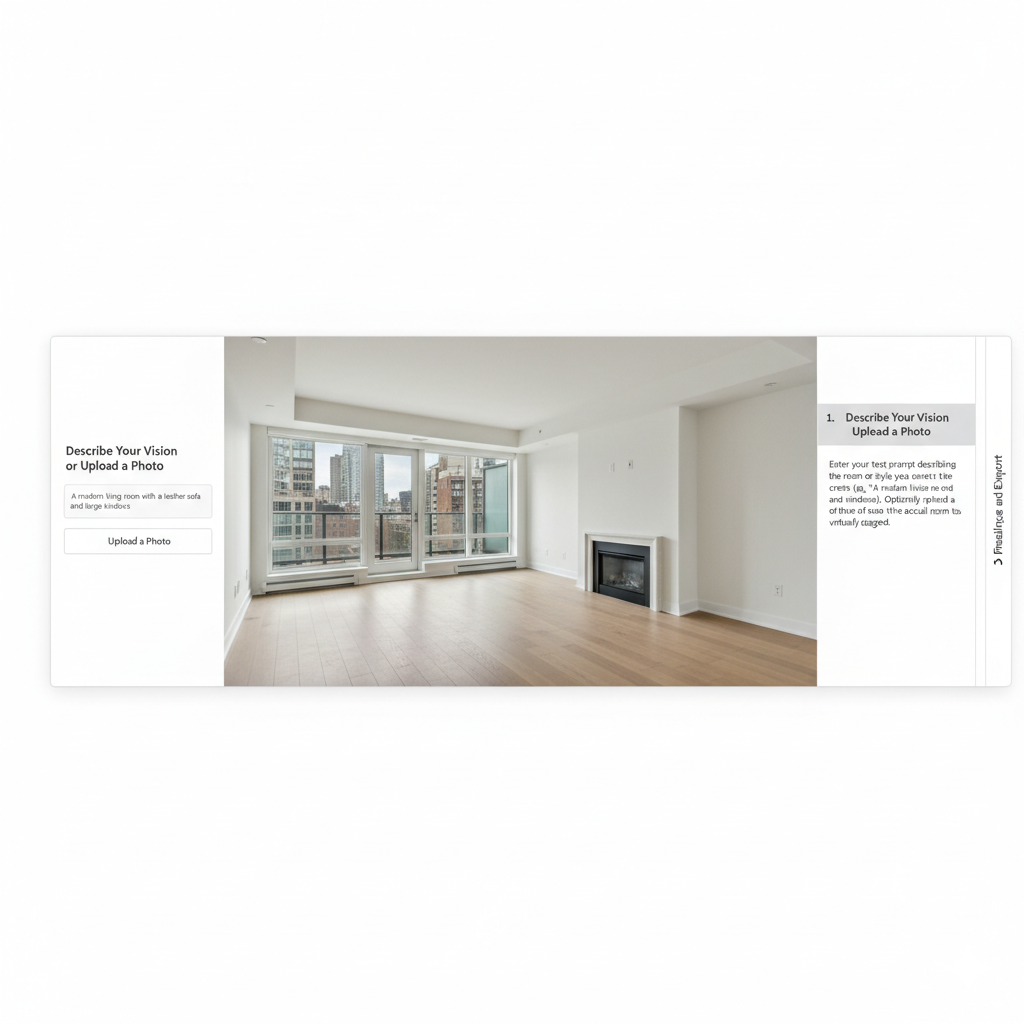 Enter your text prompt describing the room or style you want to create (e.g., "A modern living room with a leather sofa and large windows"). Optionally, upload a photo of the actual room to be virtually staged