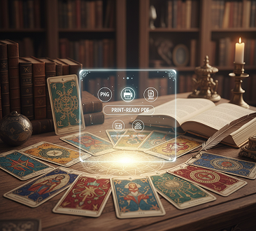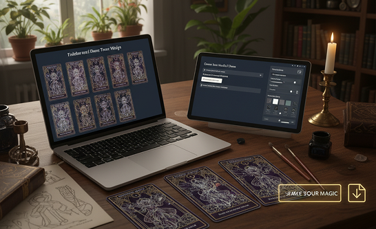 A Full Mystical Art Studio in Your Browser. Create a stunning, print-ready tarot deck in minutes, not years, and for a fraction of the traditional cost. Our tool eliminates the financial and technical barrier to deck creation, preserving your most valuable resources—creative energy and capital.