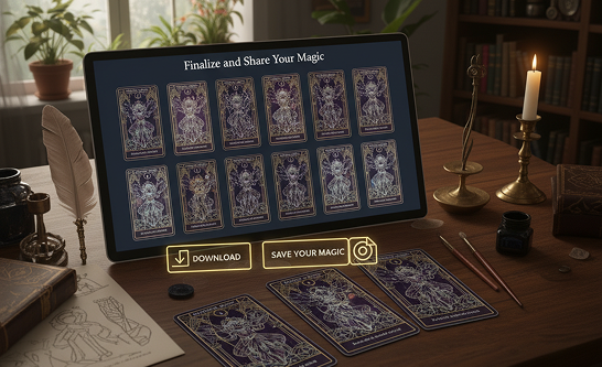 Exporting your final tarot deck is streamlined for both digital sharing and professional printing. You have full control over formats, resolutions, and organization. Your entire mystical project is saved, allowing you to revisit and edit any card or the deck's overall style anytime.