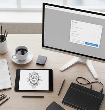 Exporting your final tattoo concept is simple and flexible. The tool gives you full control over the file, which you can take anywhere. You can always revisit and edit any stage of your design flow.