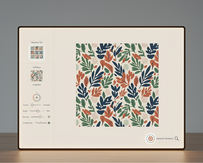 Select a repeat type: seamless tile, half-drop, or scattered. Adjust colors, scale, motif density, and complexity in real time. Generate new variations or fineโtune details until the pattern is perfect.