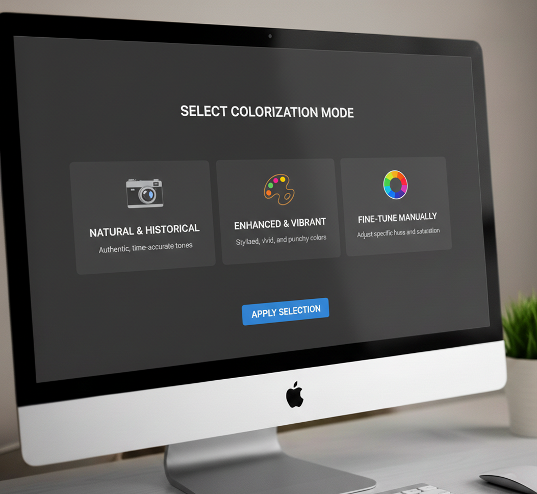 Select from colorization modes: "Natural & Historical" for authentic tones, "Enhanced & Vibrant" for a more stylized look, or fine-tune specific colors manually.