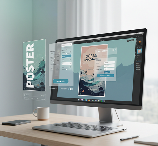 Exporting your final poster is straightforward and versatile, whether you're sharing digitally or preparing for print. You have full control over dimensions, file format, and color profile. Your project is saved, allowing you to return and make further adjustments anytime.