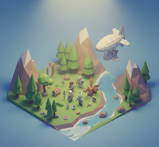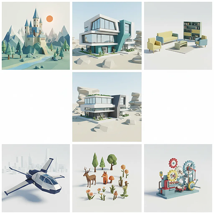 AI as your in-house low-poly concept artist. Generate hundreds of style-consistent variations—from different landscapes and architectural styles to furniture, vehicles, and organic props. This tool becomes your endless source of geometric inspiration, helping you build a versatile, scalable low-poly library that grows with your project—always clean, always cohesive.
