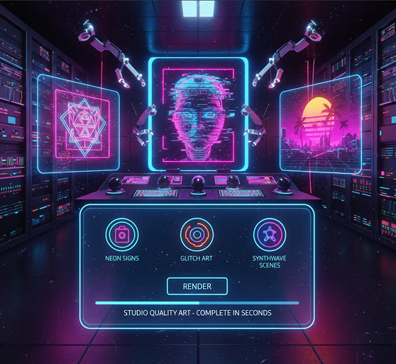 A retro-futuristic design lab in your browser. For free. Create studio-quality neon signs, glitch art, and synthwave scenes in minutes—not weeks. Our tool eliminates the technical barrier, making high-impact digital art accessible to everyone.