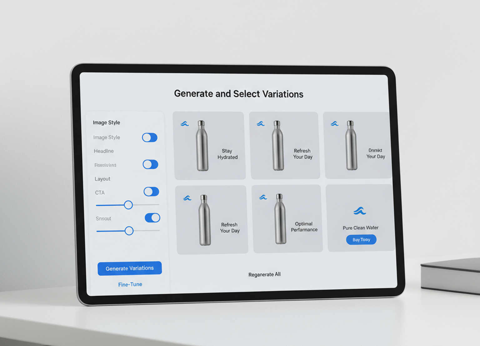 Need to test different headlines? Emotional vs. rational appeal? Use the controls to select which elements to vary (image style, headline, CTA, layout) and generate your complete test set. You can regenerate the entire matrix or fine-tune individual variants.